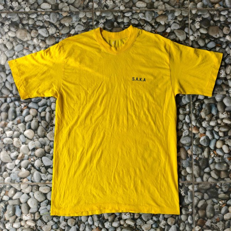 Kaos Kuning S.A.K.A Vintage Bahan katun ringan, adem dipakai Warna kuning cerah, sablon tulisan S.A.K.A di dada kiri Model tanpa jahitan samping (lebih nyaman dipakai) Size M(73x50) Kondisi: Excellent