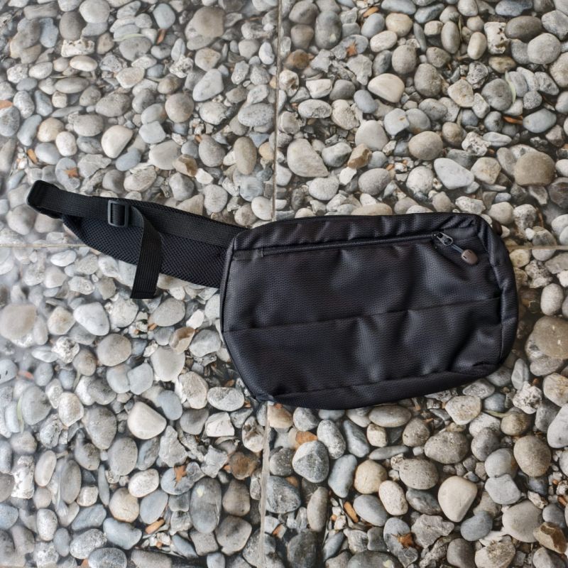 Tas Pinggang Hitam Simple – Model kasual, cocok untuk harian & traveling Material: kain sintetis dengan lapisan dalam. Kompartemen: 1 saku utama ber-zipper cukup luas. 1 saku depan ber-zipper. Bagian belakang ada tambahan lapisan jaring.